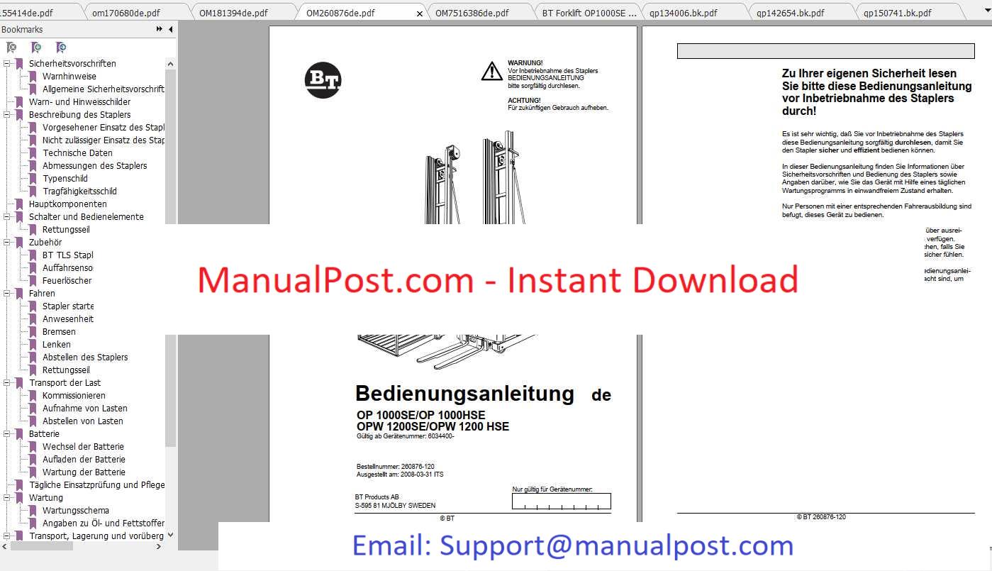 BT Forklift OP1000SE Spare Parts Catalog, Operator & Service Manual